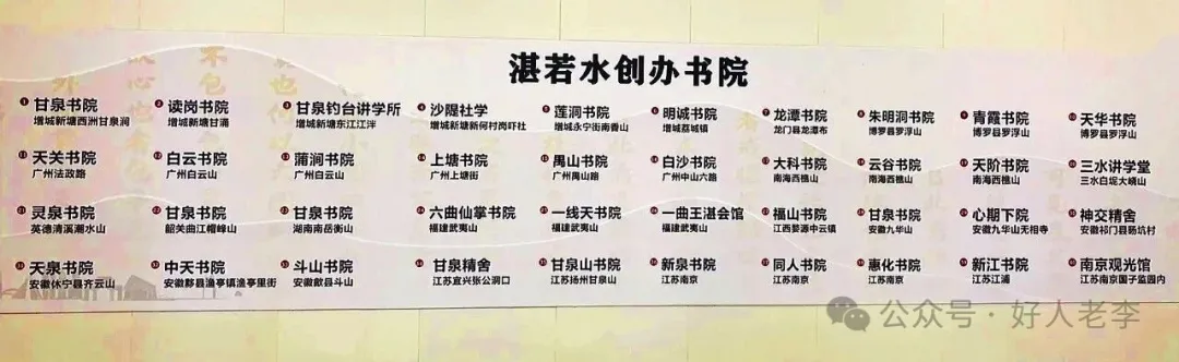 虽长期担任朝廷官职,但在多地开设书院讲授理学,终成一派,被称为“甘泉心学”。一生创立33所书院。75岁致仕,95岁病逝于广州禺山精舍。 明代心学发展脉络是:陈白沙开启,湛若水完善,王阳明集大成。